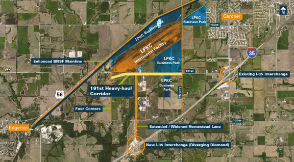 The BNSF will be opening an inland port in Edgerton Kansas, twenty miles outside of Kansas City in the fall of 2013. The 1,000-acre facility will have 440 acres devoted to an intermodal terminal with an initial capacity of 500,000 lifts. A supporting logistics network of warehouses and other distribution services is being developed on the remaining 560 acres. This facility will replace the Argentine Intermodal Facility (Kansas City), BNSF’s eighth busiest intermodal terminal. At full build-out the BNSF Edgerton Intermodal Terminal will have the capacity to process 1.5 to 2 million lifts per year. The entire project is called the Logistics Park Kansas City.