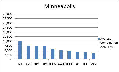 The interstates that support freight originating in, destined for, and traveling through Minneapolis include I-35 and I-94. In total, Minneapolis has 32 urban interstates, freeways, and expressways that support freight movements. I-94 and its national connectors I-394, I-494, and I-694 are the top four roadways ranked by average combination AADTT per mile. In total I-94, I-394, I-494, and I-694 carry 52.4 percent of truck miles traveled on urban interstates, freeways, and expressways within Minneapolis.