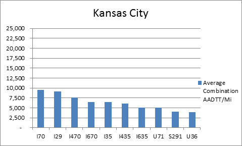 The interstates that support freight originating in, destined for, and traveling through Kansas City include I-29, I-35, I-49B, and I-70. In total, Kansas City has 30 urban interstates, freeways, and expressways that support freight movements. I-70 and its national connectors I-470 and I-670 are three out of the top four roadways ranked by the average combination AADTT per mile. In total I-70, I-470, and I-670 carry 26.7 percent of truck miles traveled on urban interstates, freeways, and expressways within Kansas City.