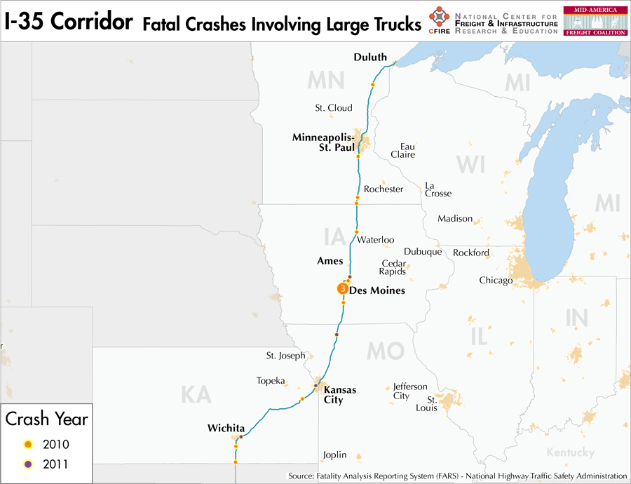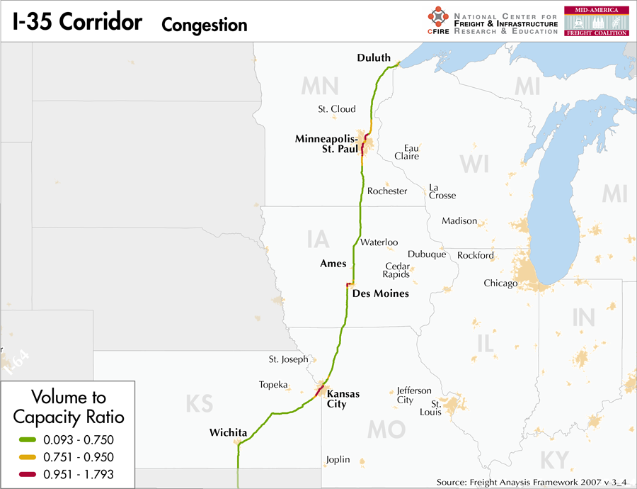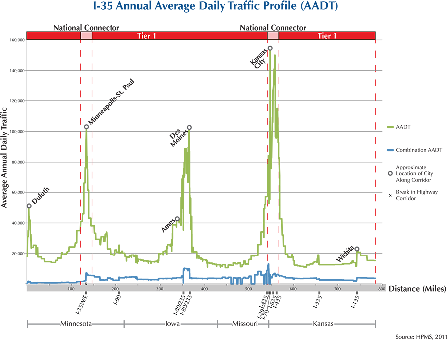 I-35 is an 870-mile corridor that crosses four states in the MAFC: Minnesota, Iowa, Missouri, and Kansas.