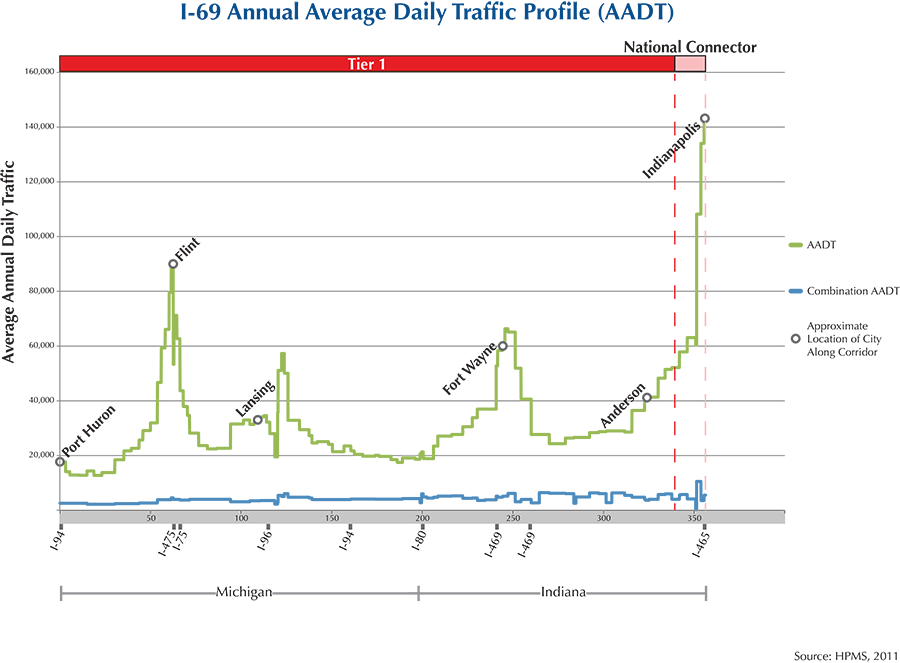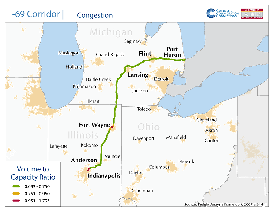 This corridor qualifies as a Tier 1 fright corridor in the MAFC nationally significant corridor network from its origin at Port Huron, Michigan to Indianapolis, Indiana. The high traffic volumes, current and proposed international connections, and multistate functions reflect the importance of this expanding corridor. Parallel rail service in close proximity is available across most of the route. A Great Lakes to Mississippi River route could replicate the national-level moves on I-69, however, the marine network would prove a much longer and circuitous as compared to a relatively straight north-south on-road route.