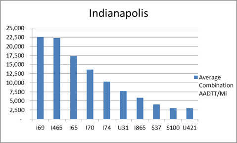 The interstates supporting freight originating in, destined for, and traveling through Indianapolis include I-74, I-70, I-65, I-70, and I-69. In total, Indianapolis has 12 urban interstates, freeways, and expressways that support freight movements. I-69, I-65, and I-70 rank one, three, and four respectively based on average combination AADTT per mile. Furthermore, I-69, I-65, and I-70 transport 58.5 percent of combination truck miles on urban interstates, freeways, and expressways within Indianapolis.