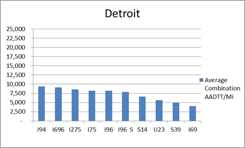 The interstates supporting freight originating in, destined for, and traveling through Detroit include I-94, I-75, and I-96. In total, Detroit has 23 urban interstates, freeways, and expressways that support freight movements. Detroit has a largely dispersed distribution of freight throughout its 23 urban connectors based on average combination AADTT per mile. The top four roadways by average combination AADTT per mile are I-94, I-696, I-275, and I-75.