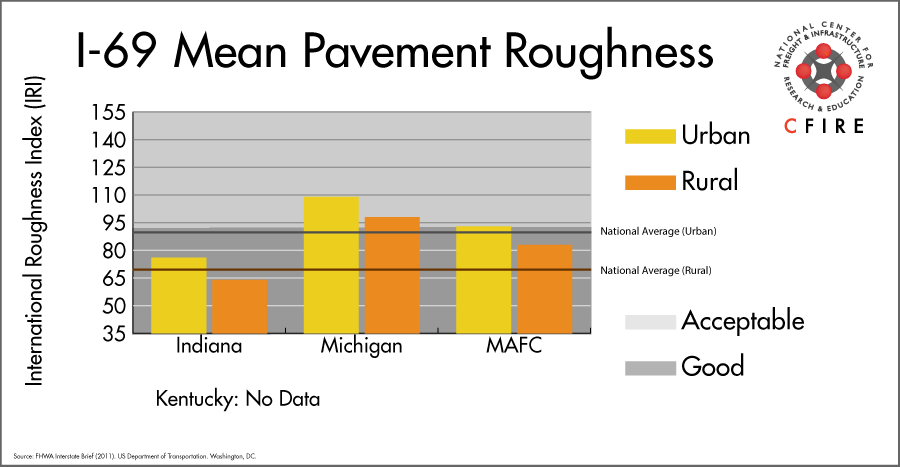 The International Roughness Index (IRI) measures the cumulative amount of vertical deviation (the bumpiness or roughness) for each segment of road, and is reported as a ratio in inches per mile. IRI values less than 95 are generally considered good, while values between 95 and 170 are generally considered acceptable. Since only corridor segments with reported IRI values from the 2011 HPMS dataset were considered in this analysis, some states may be missing from certain corridors.