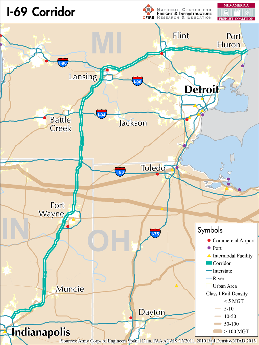 I-69, often referred to as the NAFTA superhighway, is ultimately intended to connect Mexico and Canada with a trade route through the heart of the MAFC region. The superhighway concept relies on I-69 through Michigan and Indiana and a host of other routes in Kentucky, Tennessee, Mississippi, Louisiana, and Texas as it makes its way towards the Texas–Mexico border. In Texas, I-69 was part of the decommissioned Trans-Texas corridor (2). With its origin at Lake Huron and I-94, to its terminus at the Texas-Mexico border, this corridor provides tri-national connectivity, alignment with the auto sectors in the United States, Canada, and Mexico, access to the central and Great Lake markets, and access to the northeastern United States.