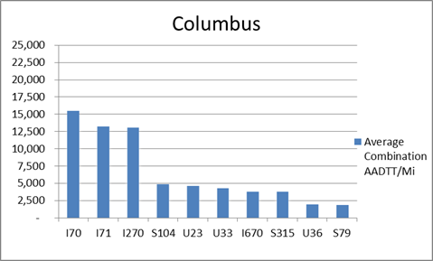 The interstates supporting freight originating in, destined for, and traveling through Columbus include I-70 and I-71. In total, Columbus has 17 urban interstates, freeways, and expressways that support freight movements. I-70 and I-71 are first and second respectively based on of the average combination AADTT per mile. Furthermore, I-70 and I-71 transport 65.3 percent of combination truck miles on urban interstates, freeways, and expressways in Columbus.
