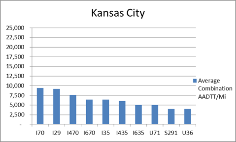 The interstates supporting freight originating in, destined for, and traveling through Kansas City include I-29, I-35, I-49B, and I-70. In total, Kansas City has 30 urban interstates, freeways, and expressways that support freight movements. I-70 and its national connectors I-470 and I-670 are three out of the top four roadways ranked by average combination AADTT per mile. In total I-70, I-470, and I-670 carry 26.7 percent of truck miles traveled on urban interstates, freeways, and expressways within Kansas City.
