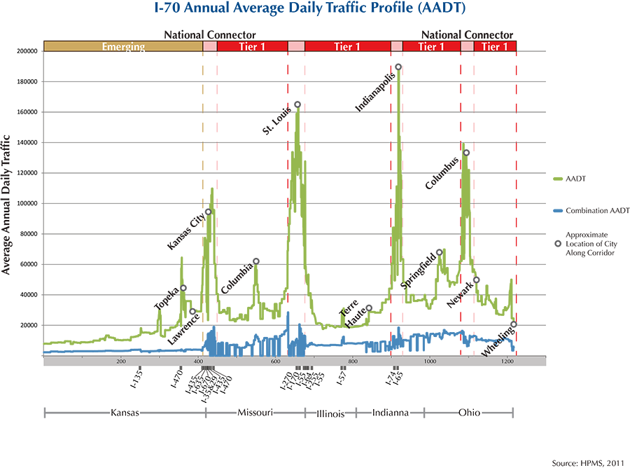 This corridor qualifies as a Tier 1 corridor on the MAFC nationally significant corridor network from Kansas City, MO to the Ohio–West Virginia border. With higher truck volumes, national connectivity, and links to numerous ports and intermodal locations, I-70 is a nationally significant corridor. In Kansas, truck volumes decrease and the corridor is classified as an emerging corridor. Given the length of I-70 across these five MAFC states, the corridor serves rural recreational and agriculture needs, commuting patterns, long distance and regional freight movements, manufacturing, and urban development.