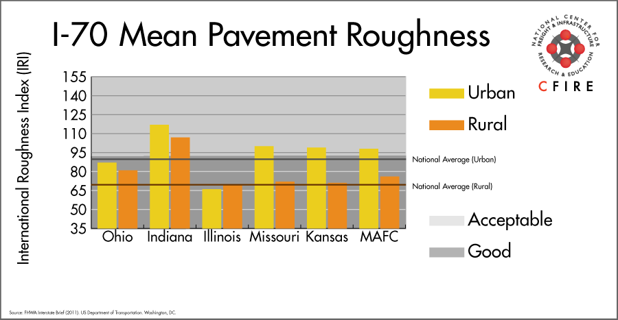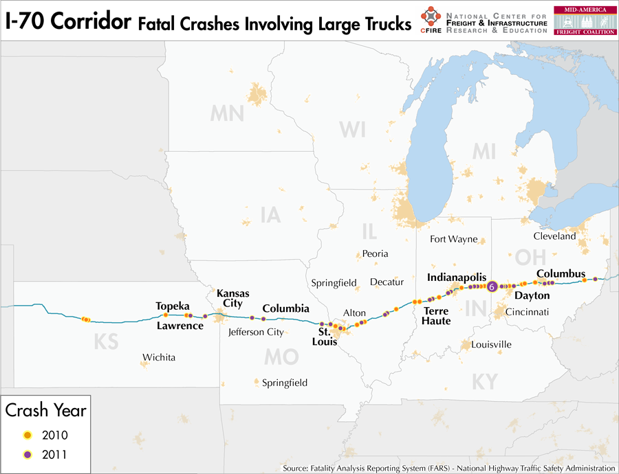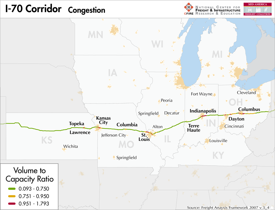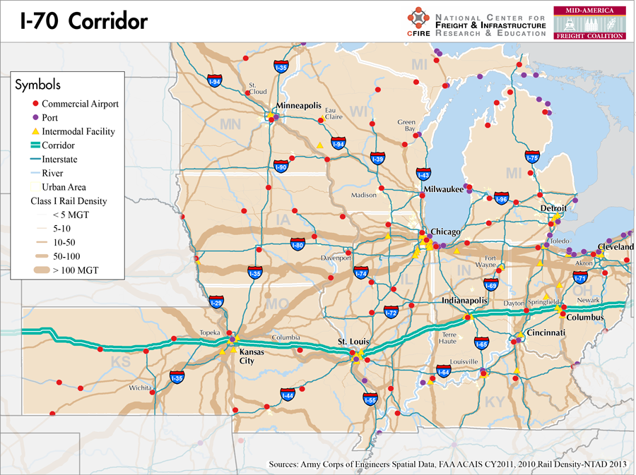 I-70 is a 1,216-mile corridor that crosses five states in the MAFC: Ohio, Indiana, Illinois, Missouri, and Kansas.